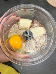 Do mixéra pridáme vajce, aby nám suroviny pekne spojilo, tretinu banánu, 1 kávovú lyžičku Vitamin Cal a jednu PL kokosu, ktorý pamlsky krásne prevonia. Všetko spolu rozmixujeme na kašu.